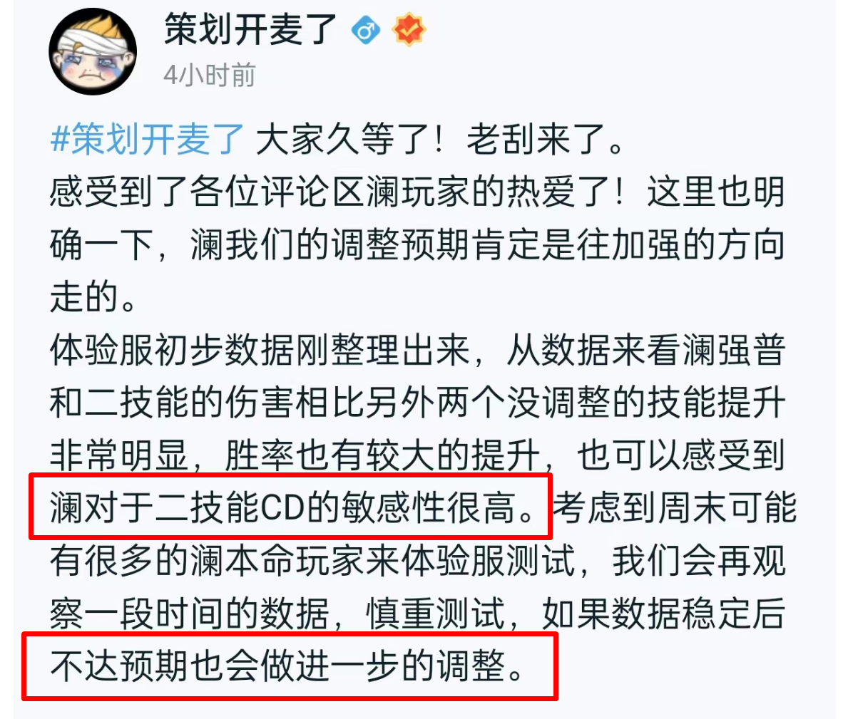 仅从数据上来看,策划没有错,调整后的澜确实变强了,只是没有解决澜的燃眉之急。一个英雄的数据和实际的体验并不成正比,澜对于二技能CD很敏感,这方面策划肯定不会乱搞,稍不注意容易让澜超标,策划还会从其他方面提升澜的强度。营地上策划表示,如果澜数据稳定后不达预期,官方会针对这个英雄做出进一步的调整,个人还是倾向于加伤害。