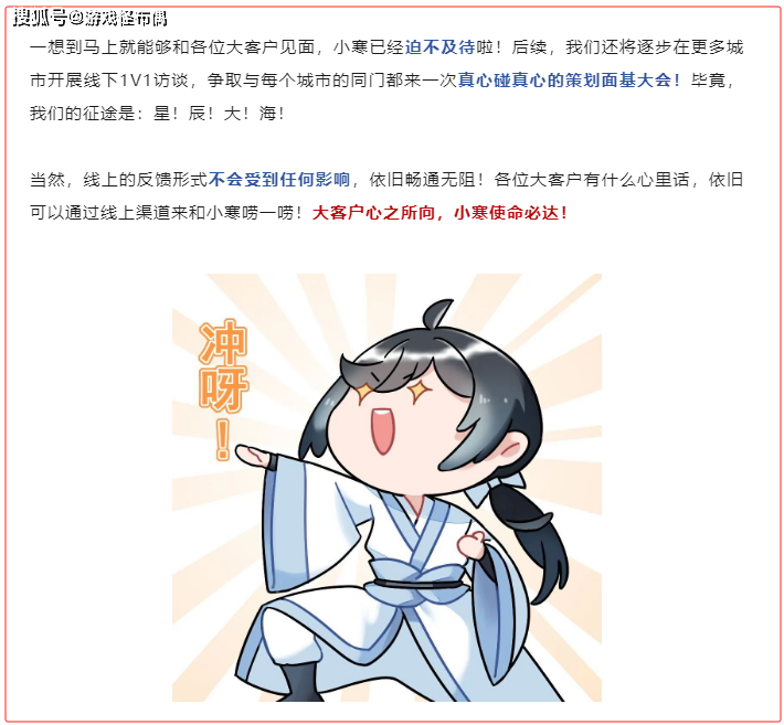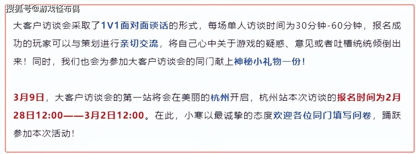 也正因为“听玩家劝”取得了卓然的成绩,《逆水寒》手游官方也干脆一不做二不休,特别策划了一场“玩家访谈会”系列活动,将要持续性的邀请玩家们面对面的跟策划团队交流,以零距离沟通的方式,最直接提出对游戏发展和体验有帮助和建议与希冀。