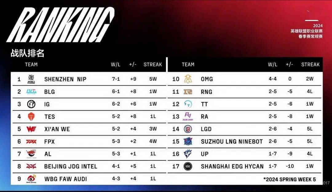 我们看一下排名,目前NIP在多赛一场的情况下排名第一,预计后续NIP战队的排名可能会呈现出下降趋势,但季后赛名额肯定是稳了,个人认为NIP最终的排名可能在第三第四的位置,JDG仅仅只打5场的情况下,看好后续能冲上来。