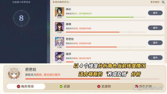 可快速查看当前队伍以及更多角色的练度情况,官方划分基本及格线,分析你角色当前的培养情况,给出可靠(绿色)、有较大提升空间(红色)的实力分析。评判标准是四个维度:角色等级、武器、圣遗物、角色天赋。