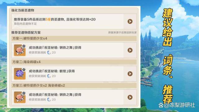 ③圣遗物:分析当前装备圣遗物的品质与等级,并给出活跃玩家的圣遗物搭配方案。