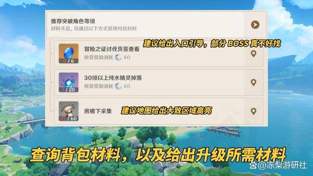 ①角色等级:分析背包内材料,不足项会给出获取方式以及产出地点。个人建议在地图跳转时,BOSS给出入口引导,材料给出大致光圈圈定,毕竟是萌新向内容。