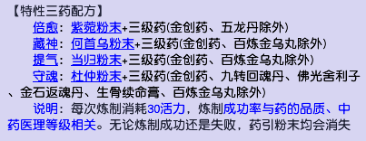 附加三药特性时,一定要注意三药品质。三药品质虽然会影响附加特性的成功率,但品质高的三药在存储时可以获得更高的特性积分。所以,大家可以保留140品质以上的大金、五龙、九转等三药来附加特性积分,他们附加特性后的价格要比140品质以下的药品贵1-2W。