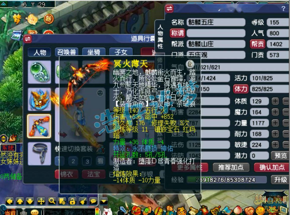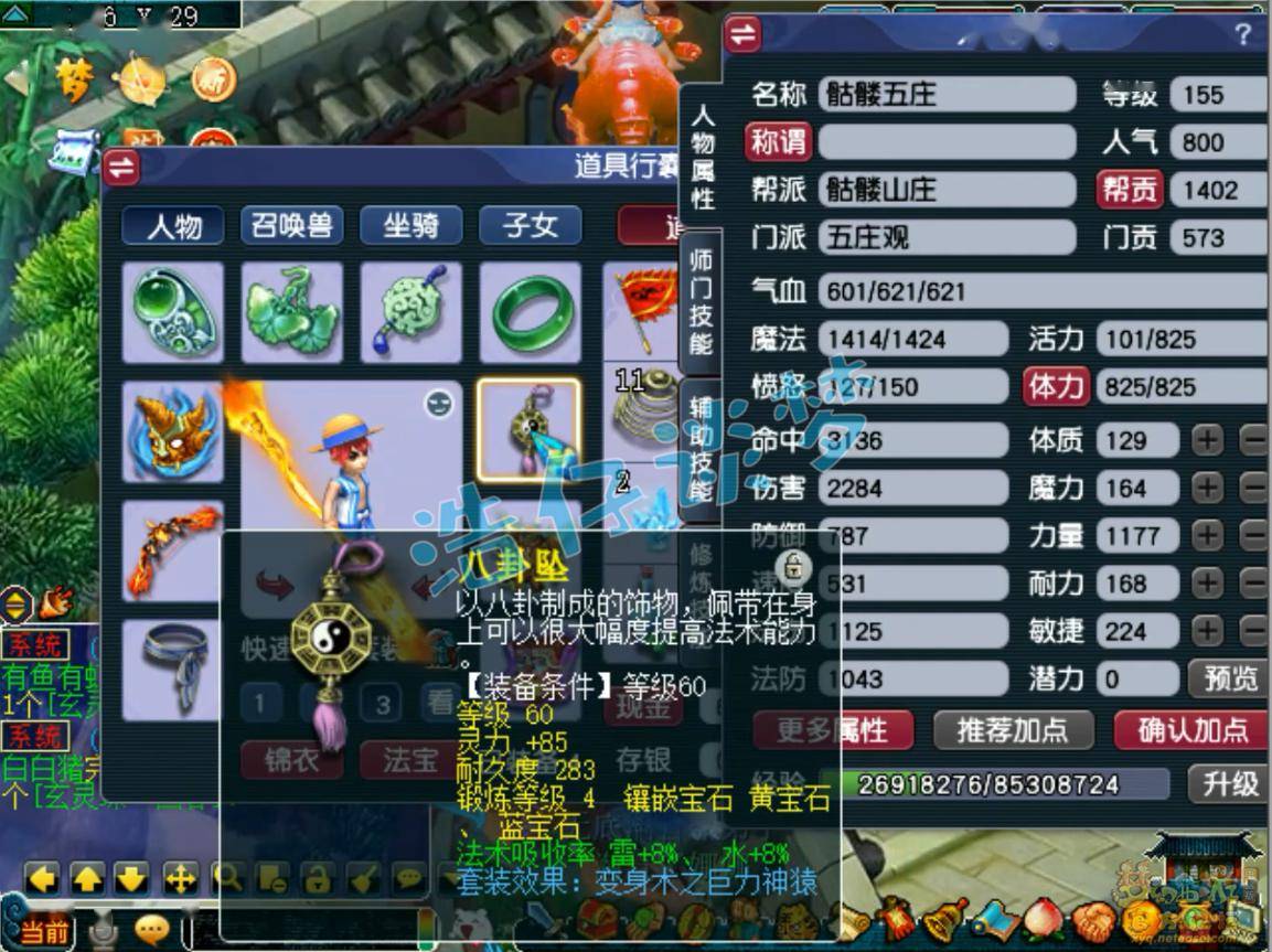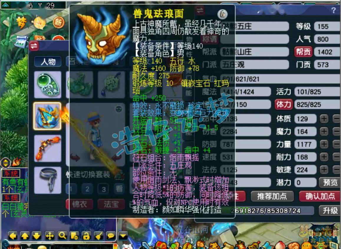 好了,这个155级骷髅五庄展示完毕,从他的装备和宝宝搭配来看,他还是比较用心的!如果要挑他的不足之处,我觉得是他的后排灵饰!后排灵饰换成抗封的比较好,毕竟这种号很容易倒地,如果被地府小死亡挂中倒地,几乎很难起来!他已经舍弃了气血属性,法防和防御属性也无所谓了,能抵抗封印才是关键,各位觉得呢?