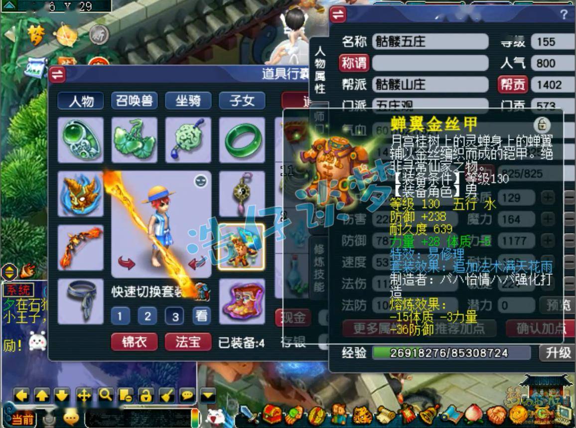 130级满天花雨套铠甲,熔炼后加25力、减20体,减体是这件装备的亮点,对于这个号来说是正面效果!