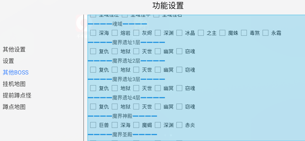 我们打开脚本,找到“其他boss”这一页,我们把需要打的魔界boss打上勾,即可实现24小时不间断刷boss。