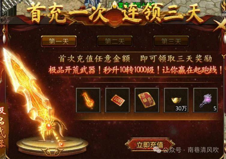 新区进区第一步,找小编领取路费,把四个赞助全部开启,大概300米左右,领取首充和累充的所有的奖励。沙城捐献也拿下,前期的属性加成非常重要,接下来就是商城必买神器等等,能买的全部都买一遍,然后跟着主线任务不停的解锁新大陆,大陆礼包是必买的资源之一。每个大陆对应绝技也必须拿下,挂机的话优先选择充值地图,里面的BOSS爆率都要比普通地图的爆率高的多,很多高阶的剑甲都是出自充值地图的。