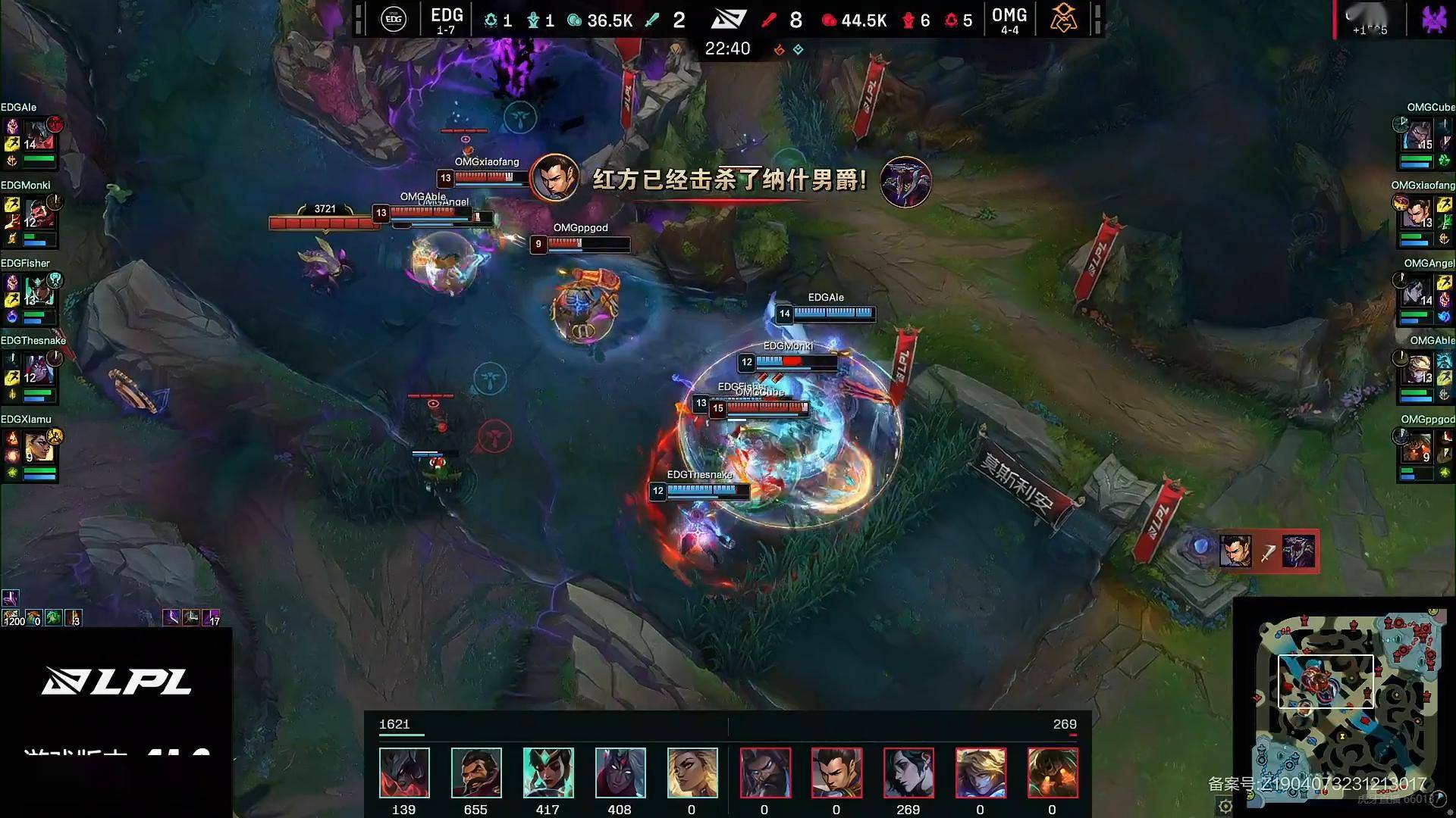 OMG继续进攻,利用Poke消耗,推掉EDG中路高地,有将EDG中上击杀,OMG直接选择一波拿下第一局比赛胜利。