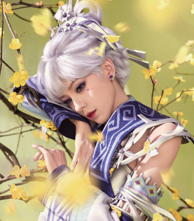 白发飘飘,美艳动人,仿佛从游戏中走出来的神女一般。肩膀和腰部的镂空设计,更是巧妙地突出了她雪白的肌肤,让人眼前一亮。