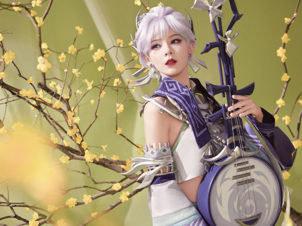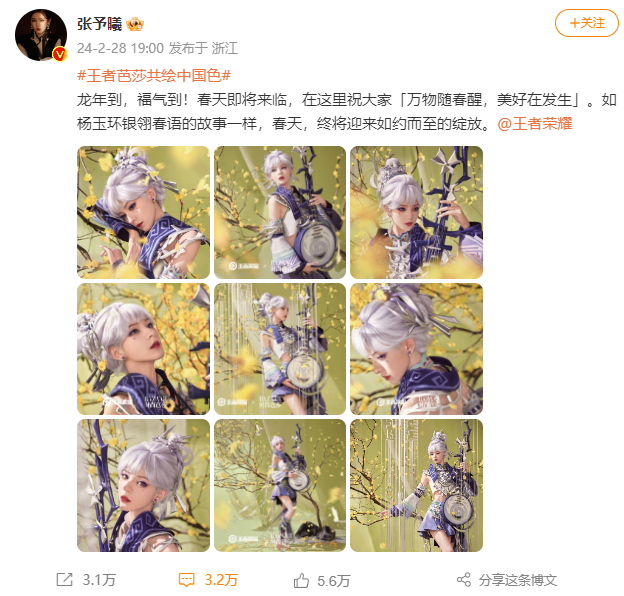 2月28日晚,张予曦在社交媒体上发布了与王者荣耀的联动照片,她所扮演的正是杨玉环的银翎春语皮肤。