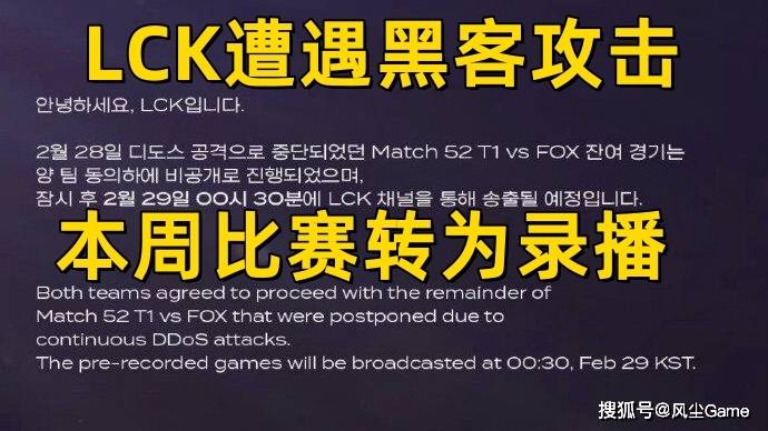 回到开头的话题,LCK网络频繁被攻击之后,已经无法正常进行游戏,在2月29日,LCK官方发文表示:本周比赛将会转为录播,具体的回复时间待定,看来技术人员,暂时没法解决网络被攻击的问题了,不过咱们LPL观众,本身就不能在官方直播间看比赛,倒也不影响。
