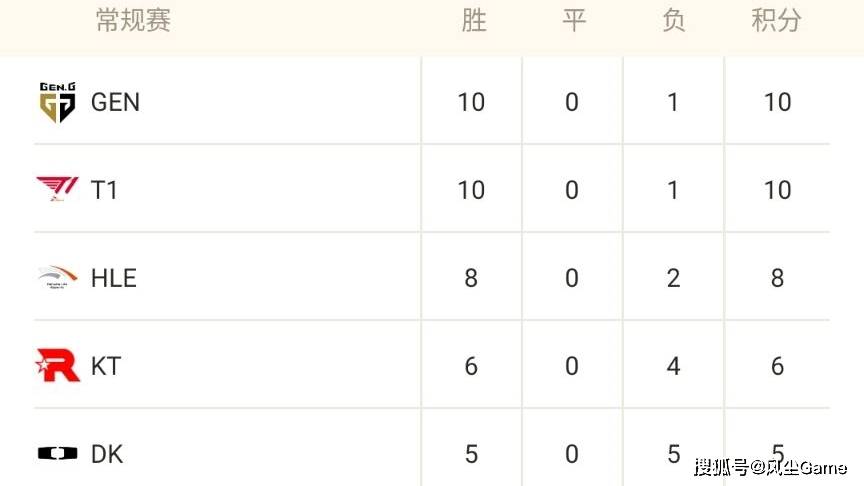 LCK春季赛已经过半了,季后赛战队也大致上能看出来,除了10-1的T1和Gen,HLE也拿到了8-2战绩,后续排在第四的KT,目前6胜4负,而DK和KDF都是5-5的成绩,剩下的四支战队,DRX和NS都是1胜,FOX最高是3胜,而BRO则是2胜,已经没什么机会竞争名额了。