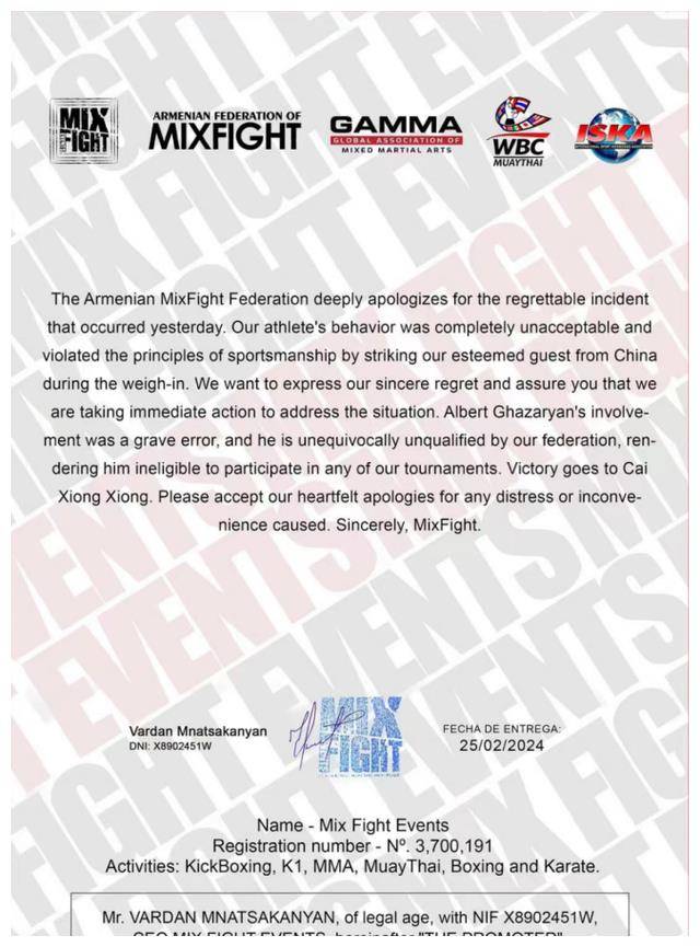 比赛当晚,称重仪式上发生了意外事件。蔡雄雄在与对手对视时被对方偷袭,这种行为严重违反了赛事规则和体育道德。事件发生后,赛事方进行了处理,永久开除了偷袭的选手。蔡雄雄获得了直接胜利,并表示会洗刷耻辱,夺回属于自己的胜利。