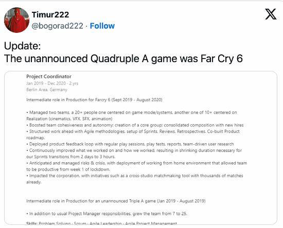 2020年,网友在项目协调员的LinkedIn资料中发现,育碧柏林正在开发一款4A游戏,现在这款游戏已被证实为《孤岛惊魂6》。