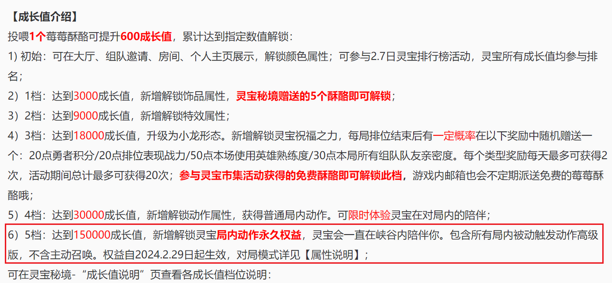 总结下来玩家有两点疑问,第一个是主动召唤灵宝功能下架了。很多人通过花费点券做任务获得永久的灵宝,就是因为灵宝好看,如果不能召唤,感觉之前的努力全部浪费。如果大家仔细看之前的活动公告就不会有此疑问,玩家达到15万成长值,解锁的事灵宝局内动作永久权益,他会一直在峡谷内陪伴你。但是,后面有补充说明,不包含主动召唤。