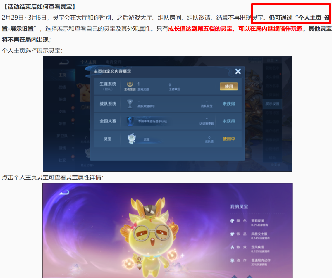 从29日到3月6日,是灵宝和大家告别的日子,在这些日子里面玩游戏,你会在大厅看到灵宝的告别表演。每一个灵宝都是自己辛苦装扮出来的宠物,告别表演一定要录屏,留作纪念。6日之后,组队、大厅、邀请、结算等页面都不会有灵宝,但个人主页依旧会有灵宝。整个活动结束后,灵宝的活动范围变小很多,此外,娱乐对局5档灵宝依旧能跟随自己。