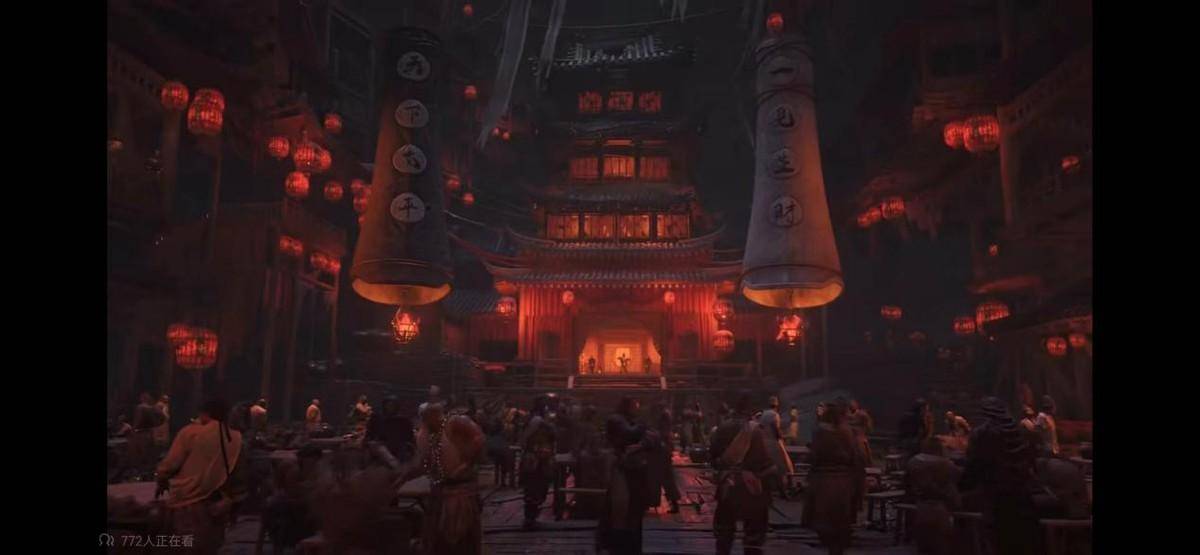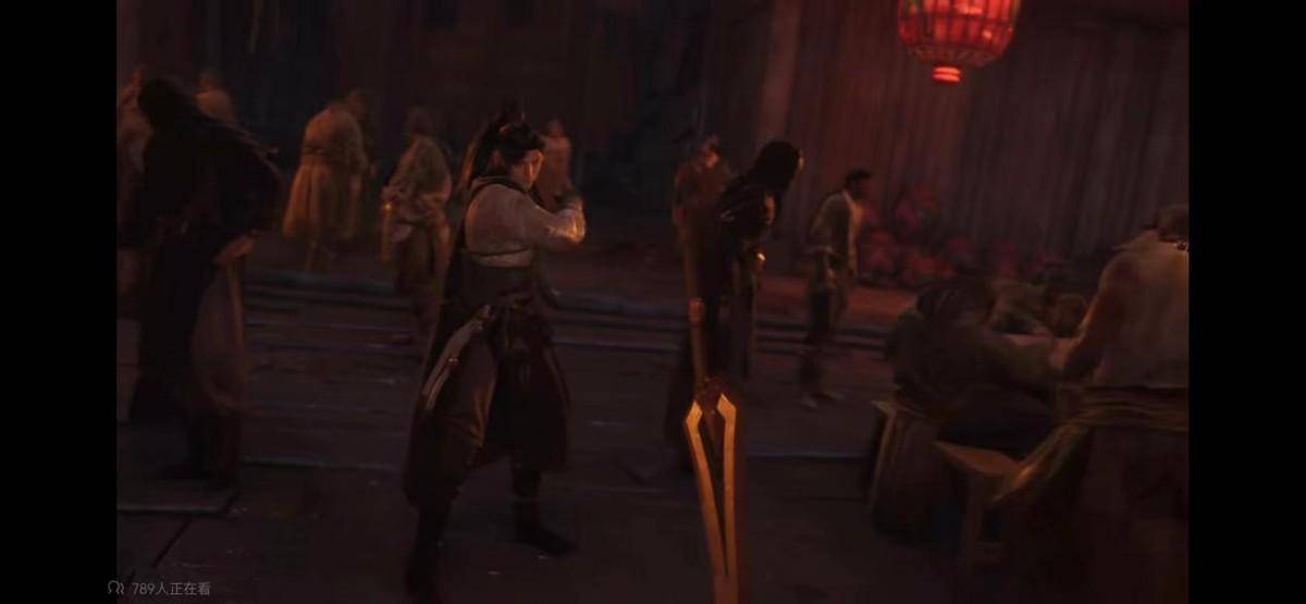 在实机PV中,开头出现了一位破履褴衫的老者敲击着编钟,画面一转可以看到战争结束后阴森的战场。随着男主推开木门,映入眼帘的是一片热闹的场景,但坐满的却是江洋大盗之类的角色,当男主救下被拐少女被围攻之后,就开始秀操作了。