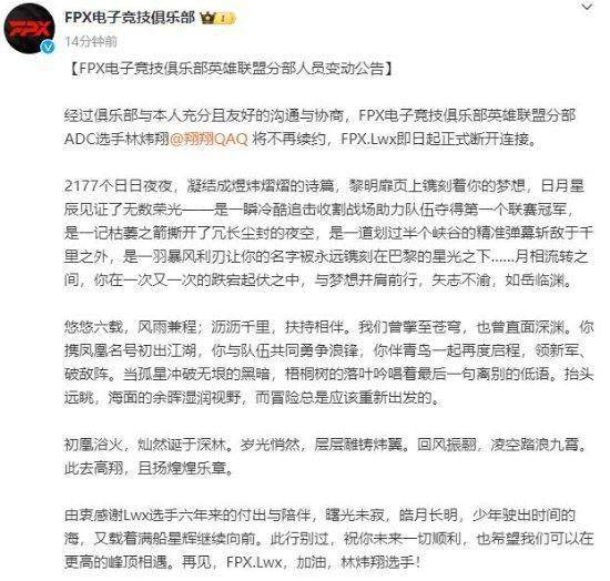 “经过俱乐部与本人充分且友好的沟通与协商,FPX电子竞技俱乐部英雄联盟分部ADC选手林炜翔将不再续约,FPX.Lwx即日起正式断开连接。”