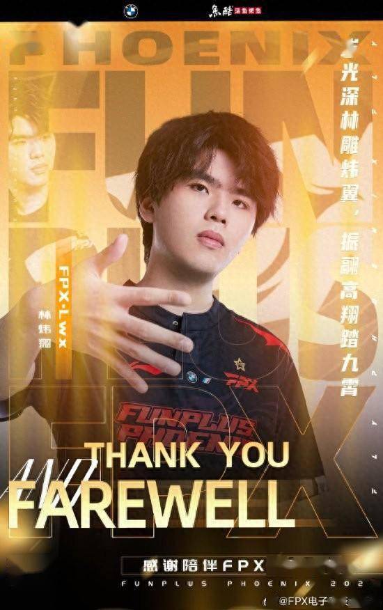 “由衷感谢Lwx选手六年来的付出与陪伴,曙光未寂,皓月长明,少年驶出时间的海,又载着满船星辉继续向前。此行别过,祝你未来一切顺利,也希望我们可以在更高的峰顶相遇。再见,FPX.Lwx,加油,林炜翔选手!”