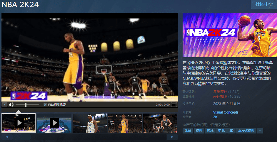 前年骂完记得买,去年买完记得骂,今年又是边骂边买,几番神奇操作甚至一度将《NBA 2K24》推到了Steam市场的畅销榜中。这让我每当打开商店页面时,都会对着红色醒目的差评评价,与蓝底白字的畅销产品栏陷入无尽的沉思——是谁让“NBA2K”摆的这么有恃无恐?
