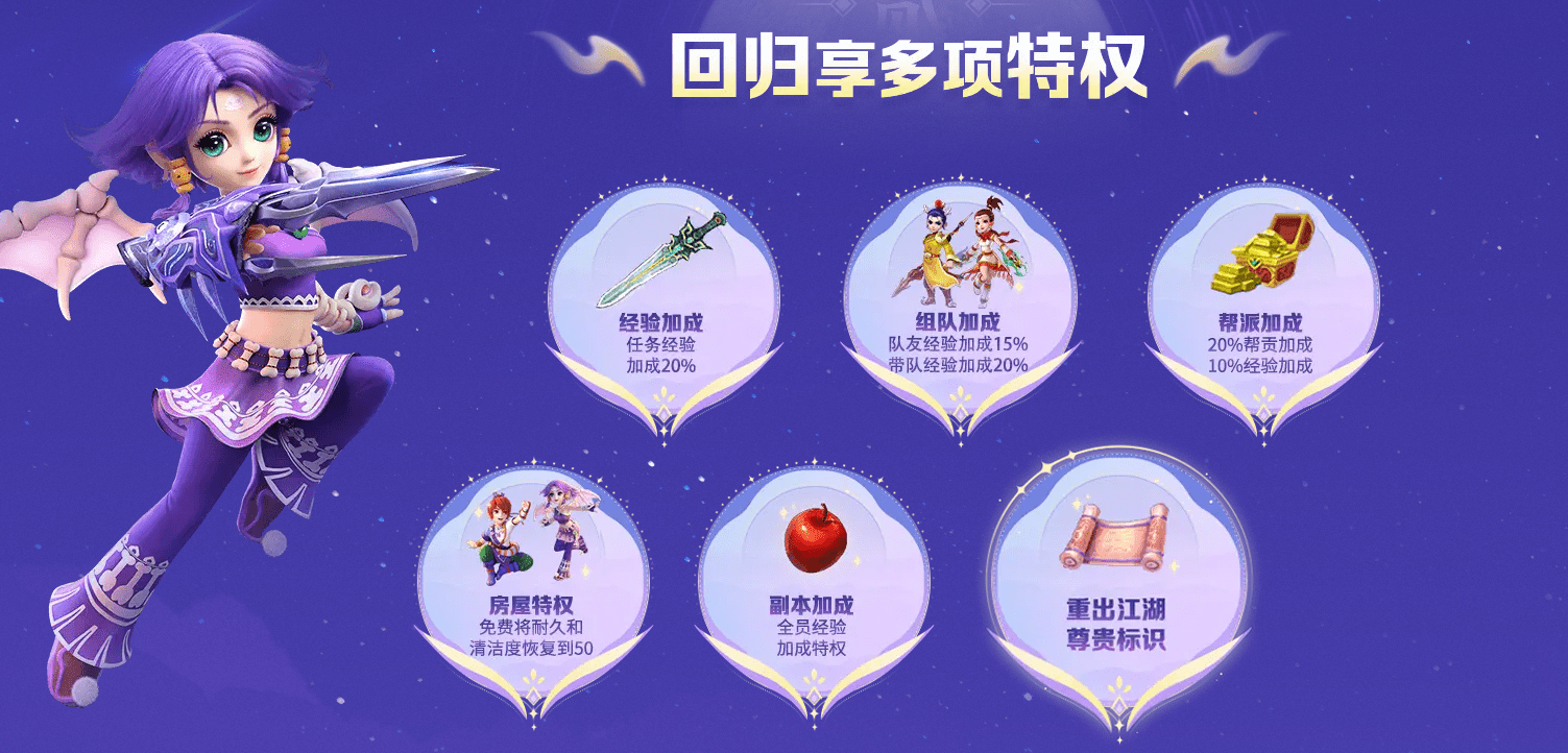 回流的少侠可以直接享受多重经验加成奖励(任务、组队以及帮派均有加成),并且获得重出江湖尊贵标识,房屋甚至可以获得免费将耐久和清洁度恢复到20的超棒特权。除此之外,定制任务副本、定制藏宝阁以及泡泡助战等多重尊享回流服务让少侠在回流过程中没有任何后顾之忧!