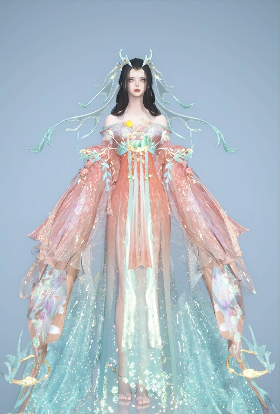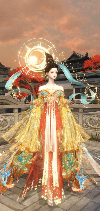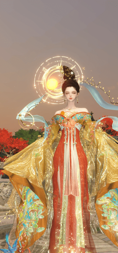 原版时装本就非常惊艳,若是搭配适当的染色更能凸显出这套时装的美。比如博主@却续的染色就相当惊艳,敦煌风的配色完美凸显出【玉泽凌烟】时装的大气端庄,金色与橙红色为主的色调宛如九天神女,搭配专属背挂【烟波渺】更是仙气十足,日月相依的造型与这套时装适配度max,走在哪里都会成为最吸睛的存在~