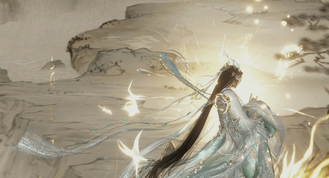 仅需一个合适的拍照地点,即可让整套时装意境感UPUP,由于这套时装本就仙气十足,宛若画中人,因此我们可以参考博主@听风述野的作品,在镜天阁老二的画卷中进行拍照。水墨风的画卷搭配这套时装好似画中游仙,无需太多修饰装配即可拍出相当惊艳的成片。