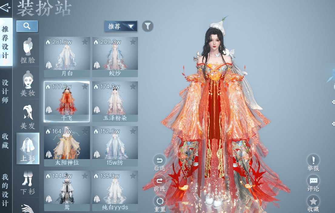 如此非凡的白泽时装,难怪会让整个江湖的玩家都心动,在设计站也有大量的设计师们为这套时装染出绝美的色彩,比如这套金红色系的白泽时装,颇有凤凰之感。
