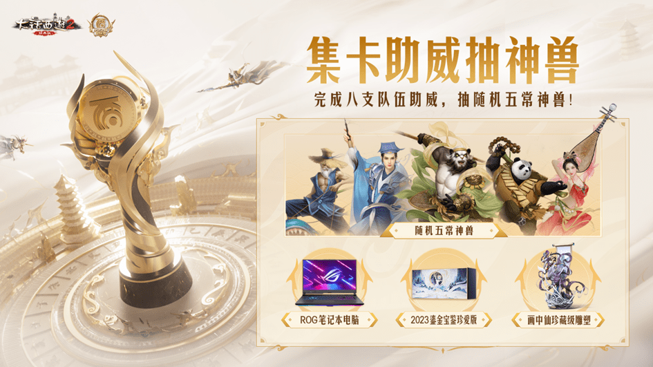 卡助威活动目前正在进行中,少侠可在游戏内购买与收集比武之巅荣耀卡,来为八强战队加油助威,有机会赢取随机五常神兽、ROG笔记本电脑、2023鎏金宝鉴珍爱版、画中仙雕塑等丰厚大奖!