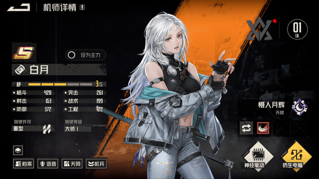 首先白月的职业为格斗家!就是跟开服会UP的虹一样的职业,这个职业主要讲究拳拳到肉,以拳套和长柄等近战武器为核心,而白月则是更多会使用长柄,虹则是更多会使用拳套/打桩机。此外白月可以驾驶重型机兵,这也从侧面说明了她的生存能力应该不会差,最适配的机兵肯定是S级机兵赫拉克勒斯,当然有关这个以大力神为名的机兵我们待会还会详细的讲到其用法与优势点。