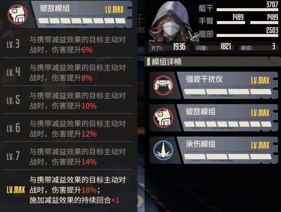 然后【破敌模组】和白月就是天作之合,满级后还有debuff持续回合+1的效果,最后的承伤模组则可以变向提升白月的生存能力,亦是非常适配白月的模组选择。