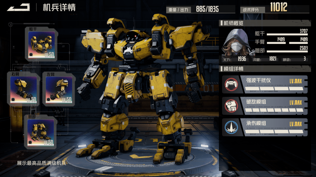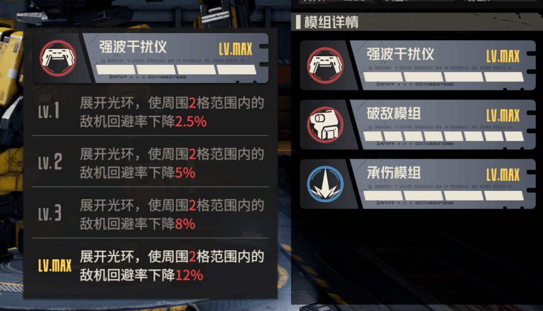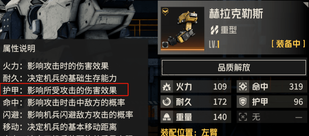 最后我们来说白月适配的机兵,刚刚开头就提到了毫无疑问她最适配的机兵便是赫拉克勒斯,这个机兵属于S级重型机兵,其中【强波干扰仪】也是一个周围2格的光环类效果,不过debuff是回避率降低,可以变向提升我们的命中率。