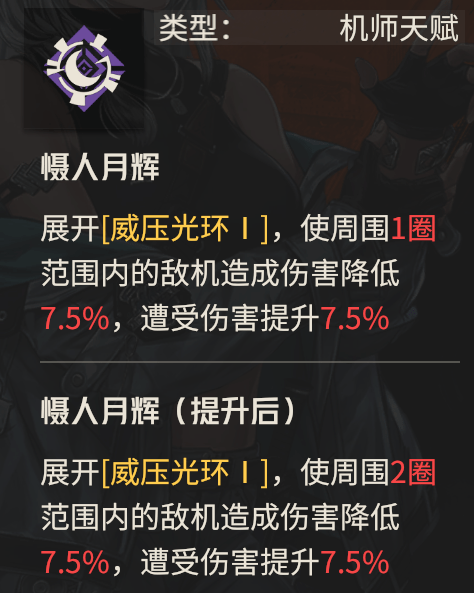 接着为啥有朋友会认为白月属于团队型角色呢?她的天赋就说明的这一点,基础让1圈内的敌人伤害降低7.5%,受到伤害提升7.5%,潜能3进阶后可以让2圈内的敌人伤害降低7.5%,受到伤害提升7.5%,这是个什么概念呢,大家可以参考下图:
