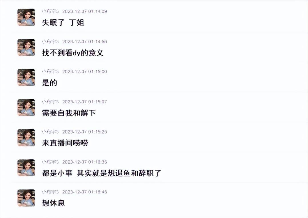 今天凌晨的时候,颜值区的女主播小布丁的周榜大哥“小布宇3”现身直播间互动,他沮丧说道:失眠了丁姐,找不到看直播的意义了,其实就是想退鱼和辞职了,想休息,我说实话也不图啥。