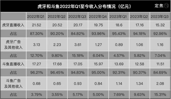 根据财报数据,今年以来,虎牙和斗鱼的直播收入占比逐季降低,但虎牙本季度仍达92.96%,而斗鱼下滑至84.69%。至于广告和其他收入方面,虎牙今年的发展不如2022年的整体表现,而在本季度,斗鱼的广告收入创新高,达15.31%,财报显示是因为有游戏会员业务的助力。