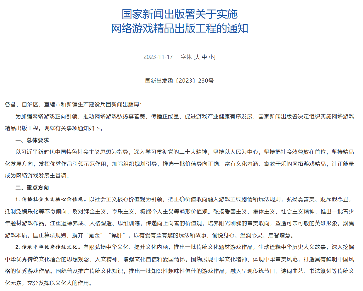 今年10月,国家新闻出版署发布《关于实施网络游戏精品出版工程的通知》,提到要围绕展现中华文化精神、体现中华审美风范,打造具有鲜明中国风格的优秀游戏作品。