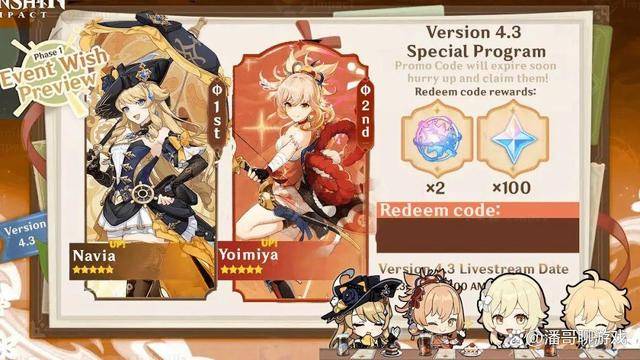 根据以往惯例,预计4.3版本前瞻会在12月8号开启,到那时将会公布卡池情况,还会有300原石兑换码,大家千万不要错过。