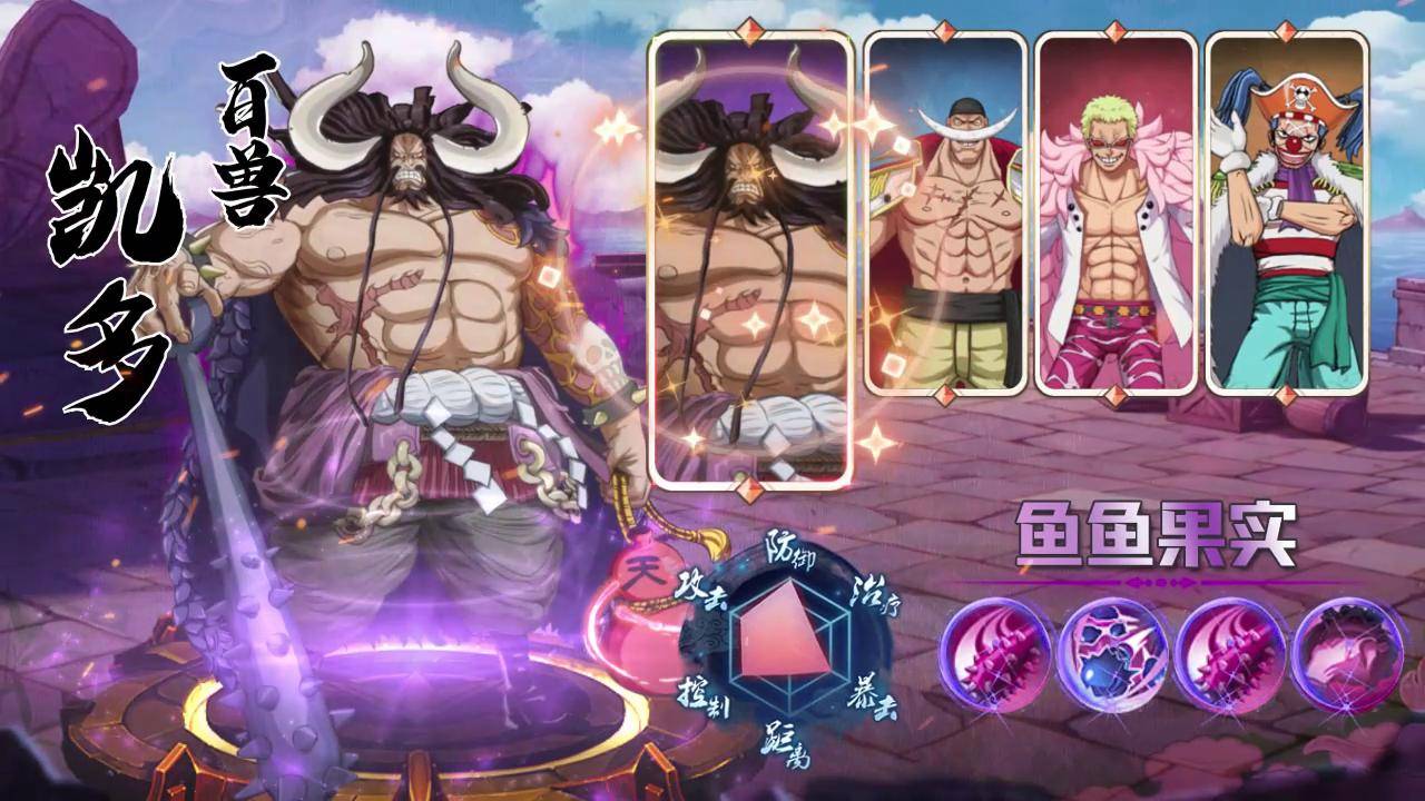 1. 黄猿、纽盖特、香克斯、葛玲玲、百兽凯多:这个阵容整体输出高,拥有多个强力的单体攻击和控制技能。凯多配上纽盖特香克斯、葛玲玲激活四皇羁绊效果,使上阵角色暴击率和伤害提高百分之五十,无论对上什么敌人都是碾压式毒打,关卡副本轻松拿下不能过。