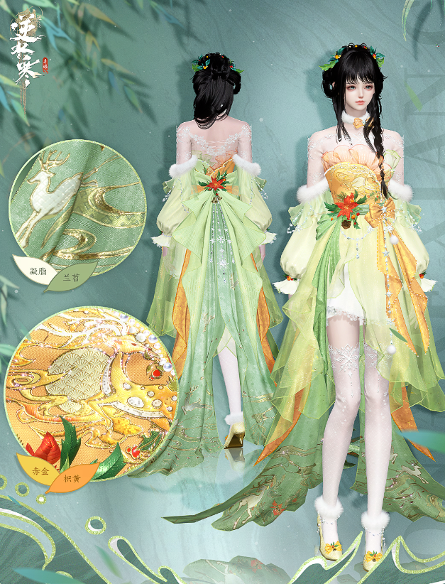 女款时装【茸客衔春】森系风十足,上半身采用薄纱搭配蕾丝边进行半透点缀,让整套时装仙气十足。胸口的橙黄色纹饰让整套时装的观感更加舒适,搭配神鹿造型让不少玩家对此爱不释手。头饰方面采用林间的花朵与树叶进行点缀,使其宛如林间公主让人喜爱有加。