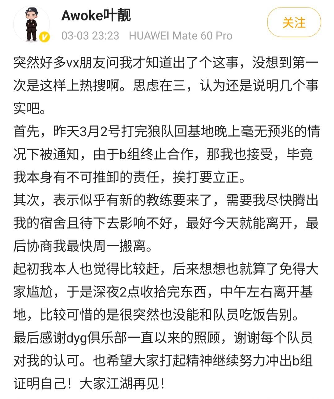 但没想到的是,虽然此时已经是凌晨一点,但DYG的选手依然还在直播中,所以这句话也就被观看直播的粉丝们都看到了,DYG的选手也是第一时间发文字表示在直播,刚刚还十分有气势的啊泽瞬间把气势缩了回去,赶紧回复我错了,DYG的不弃也是没有多说,表示没事的BaBy。