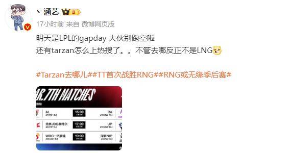 近日#Tarzan去哪儿#登上微博热搜,因为有细心的网友发现Tarzan已经有几日没有打韩服排位了。要知道Tarzan可是一位排位狂魔,早在今年1月份就完成了登顶。这很有可能是参与了其他队伍的试训,所以此事引起了诸多讨论。毕竟现在已经到了争夺季后赛席位的关键节点,无论是LPL还是LCK都有很多队伍可以在打野位置上进行补强。