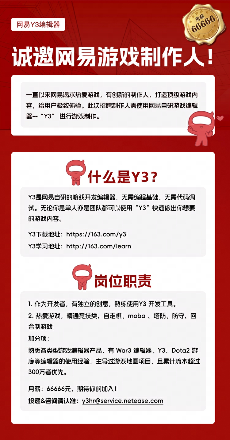 热爱不简单,实现热爱却很简单。网易游戏百万年薪招募“最6游戏制作人”,这岗位真的没那么高不可攀,毕竟有了Y3编辑器,做游戏很简单,难得的是你有宝贵的创意和行动的勇气。接下招募令,加入网易游戏,与最顶尖的伙伴们一起创造心中的游戏,不负热爱之名。
