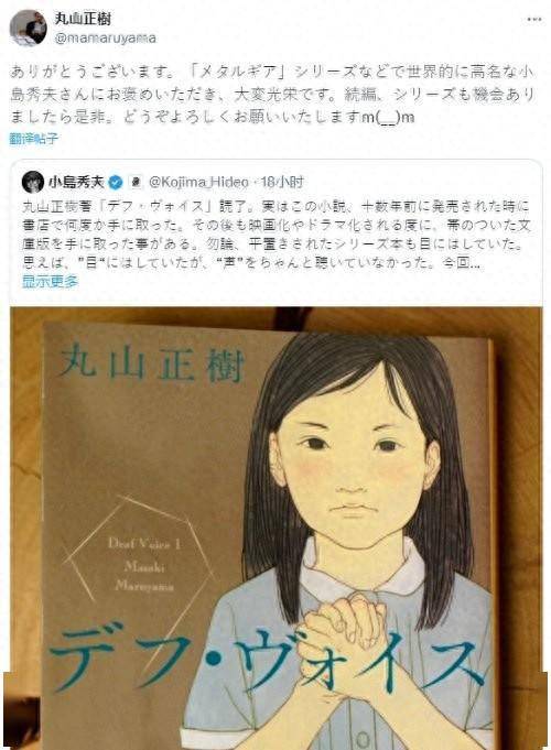 小岛秀夫最近读完了日本小说家丸山正树的《Def Voice》,发推分享道:“ 事实上,十几年前这本小说发行时,我在书店里买过好几次。 在那之后,每次它被拍成电影或电视剧时,我都会买一本带腰封的平装本。”