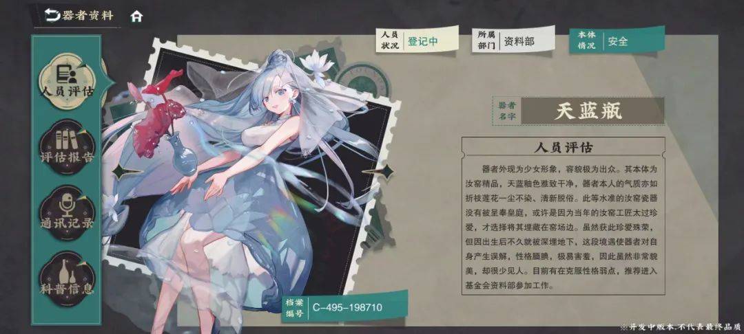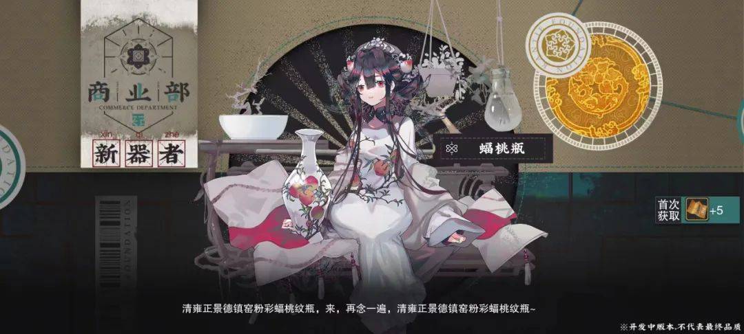 《物华弥新》更值得称赞的优势,在于“古物拟人”的价值渗透进游戏的内在。游戏创新性地将古物的特点和其经历的历史,共同融入到了游戏的叙事中,比如看板娘蝠桃瓶,它的全名是“清雍正景德镇窑粉彩蝠桃纹瓶”,角色不仅衣着上与古物的柔丽娇艳极为匹配,胆小且怕生甚至接近于“宅”的性格,其创作灵感也是来源于古物在海外长期漂泊的经历。