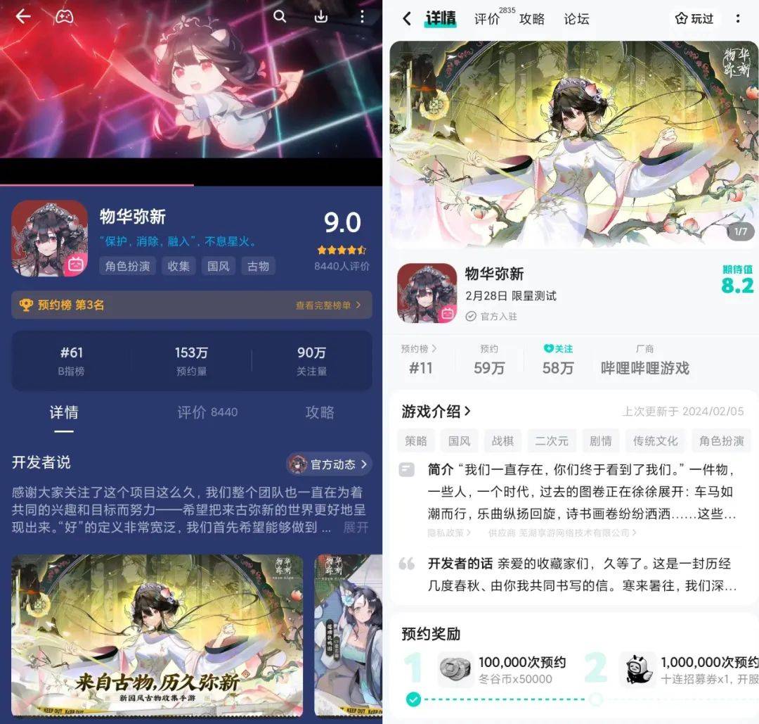 简言之,上述动作为《物华弥新》吸引到了一批体量可观且认可度极高的用户,加之B站在年轻群体的号召力,使得该作在取得版号后,一举一动都备受关注。