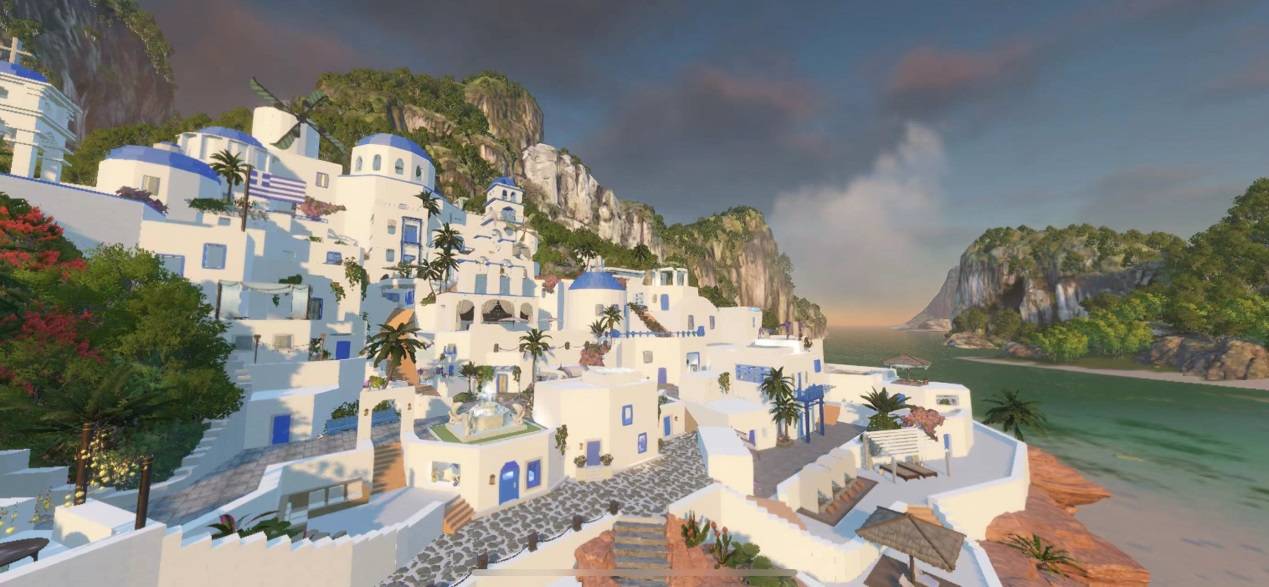 在《逆水寒》手游中,大家可以通过庄园设计站来复刻希腊的圣托里尼岛。设计师@姜饼脆脆所设计的【圣托里尼(精装版)】几乎复刻了圣托里尼的全貌。白墙蓝顶的房屋错落有致,纵横交错的街道以及肆意点缀的椰子树让整个场景看起来生机勃勃。值得一提的是作者搭建的房屋有不少都是可以进去的,若是站在屋内眺望海面也别有一番风味~