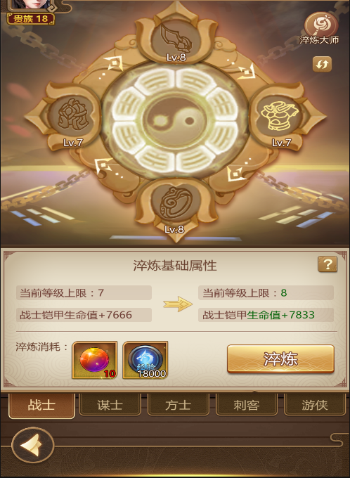 a) 概述:消耗九华玉、英雄经验、七彩珠对职业装备进行强化,全英雄有效。