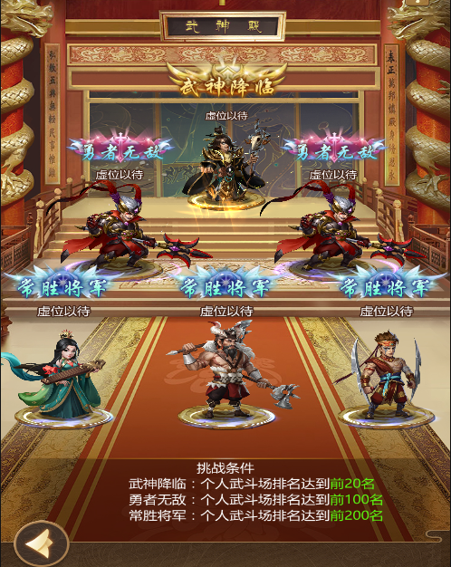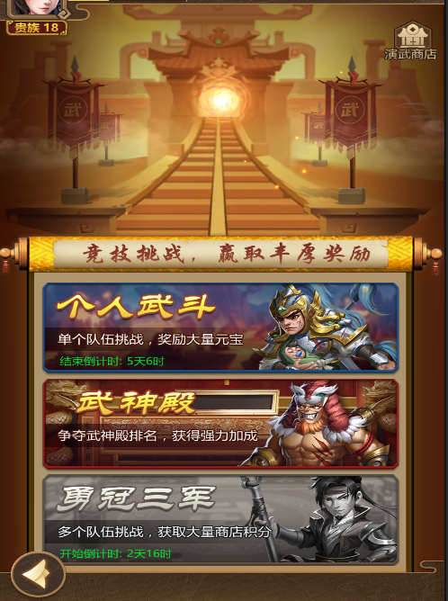 概述:玩家进行pvp匹配战斗的主要玩法,共有个人武斗、武神殿、勇冠三军三个玩法。