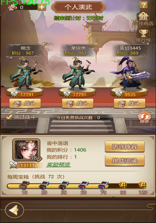 i. 概述:玩家配置三个队伍进行挑战对手,挑战胜利获得积分,根据积分进行排名,从而获得积分排名奖励。