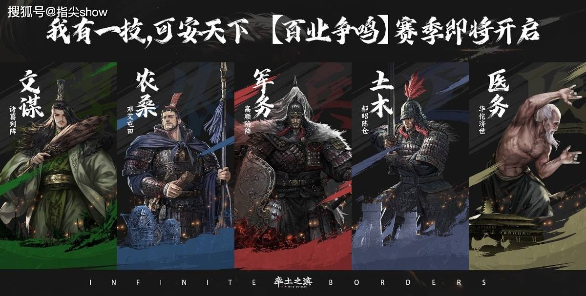 在“百业争鸣”新赛季的预告篇中,不同于传统SLG中常见的兵种设定,他们将中国古代“士、农、工、商”的概念,化作玩法融入到了游戏里,即玩家可以在文谋、农桑、土木、军务、医务五大势力发展方略中任选其一,作为自己的发展路径。